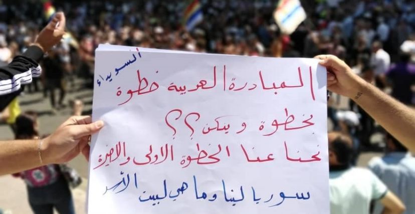 ورفعت شعارات تعارض نظام الأسد والتطبيع العربي معه، حيث ورد في واحدة منها شعار « المبادرة العربية خطوة بخطوة وينكن؟ نحنا عنا الخطوة الأولى والأخيرة.. سوريا لينا وما هي لبيت الأسد ». ا